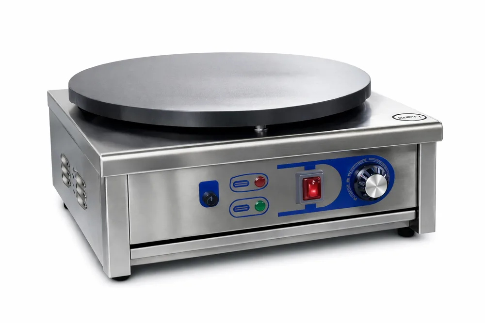 פלאנצ’ת קרפים חשמלית מקצועית עם משטח עגול איכותי, מיועדת להכנת קרפים, בלינצ’ס, פנקייקים וטורטיות ברמת דיוק גבוהה ובחימום אחיד.